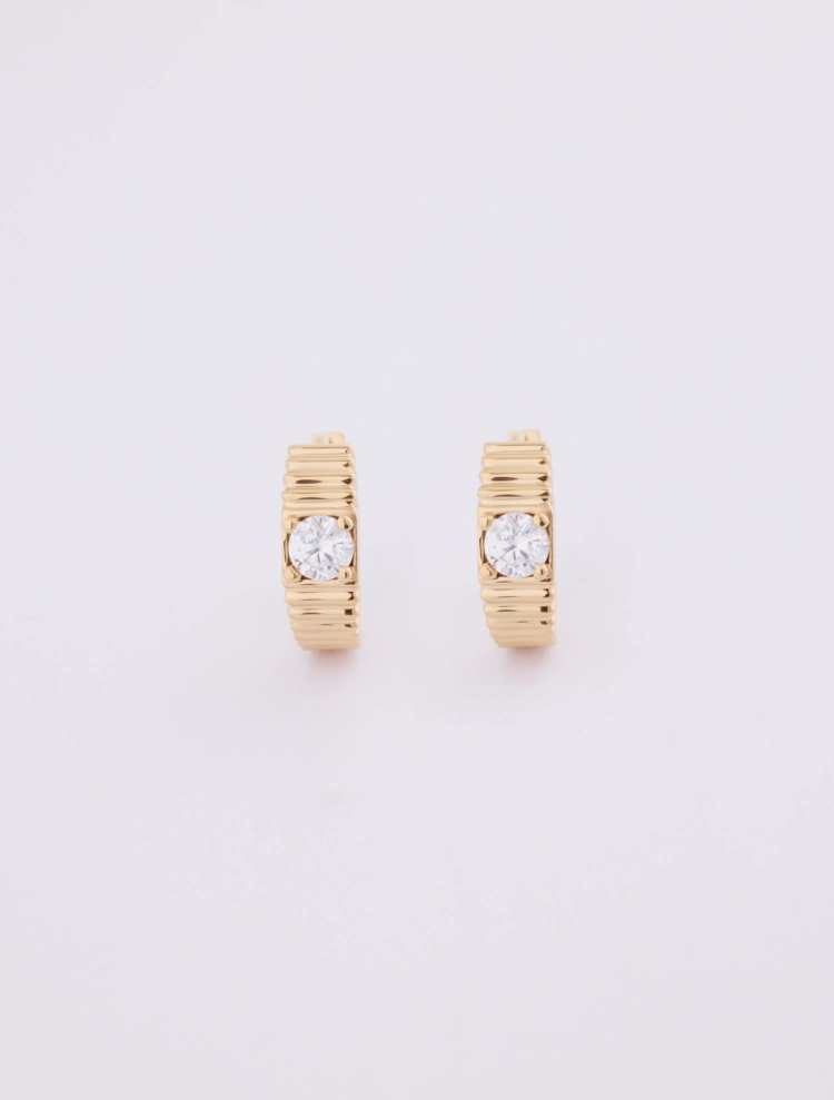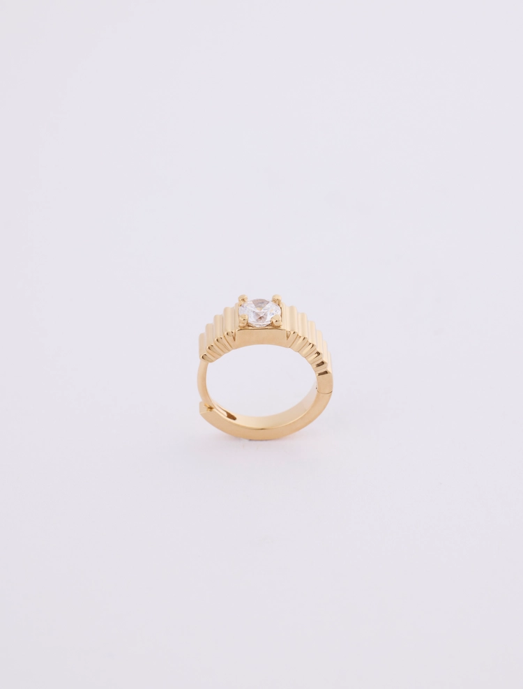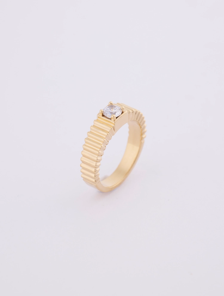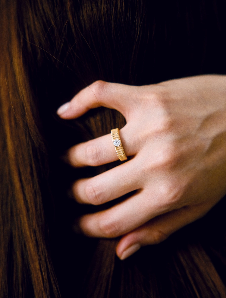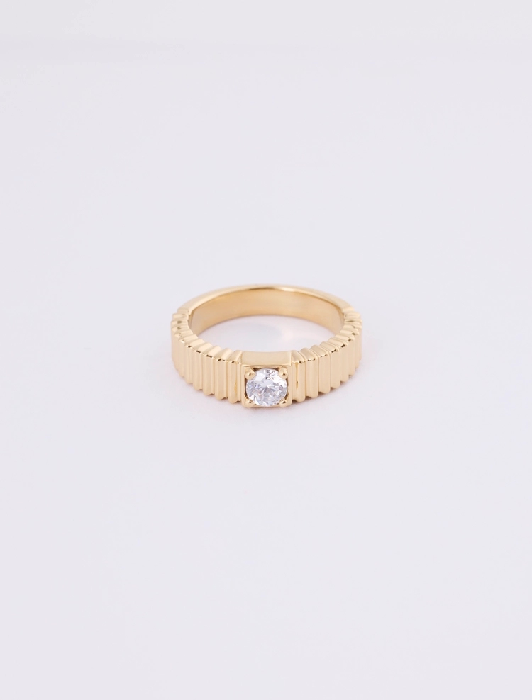 14k 골드 버메일 골지 밴드링 형태에 세팅된 브릴리언트 라운드컷의 고급스러운 화이트 토파즈가 클래식한 스타일을 완성합니다.